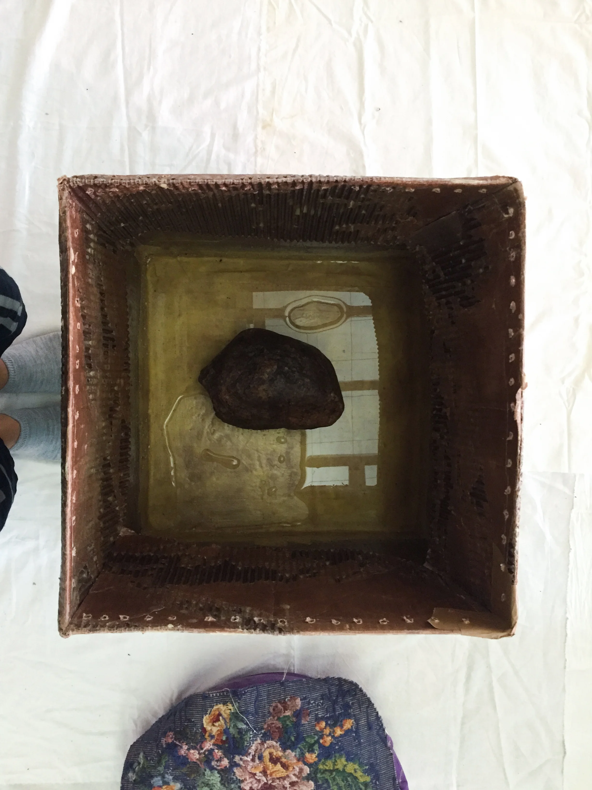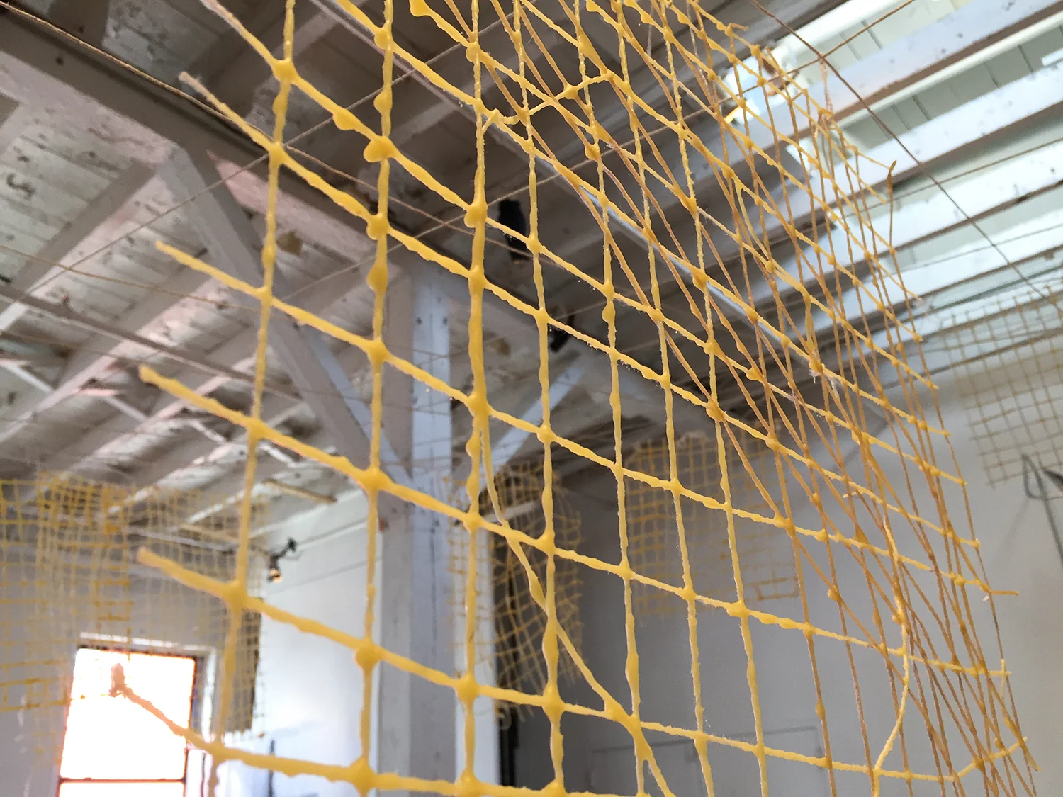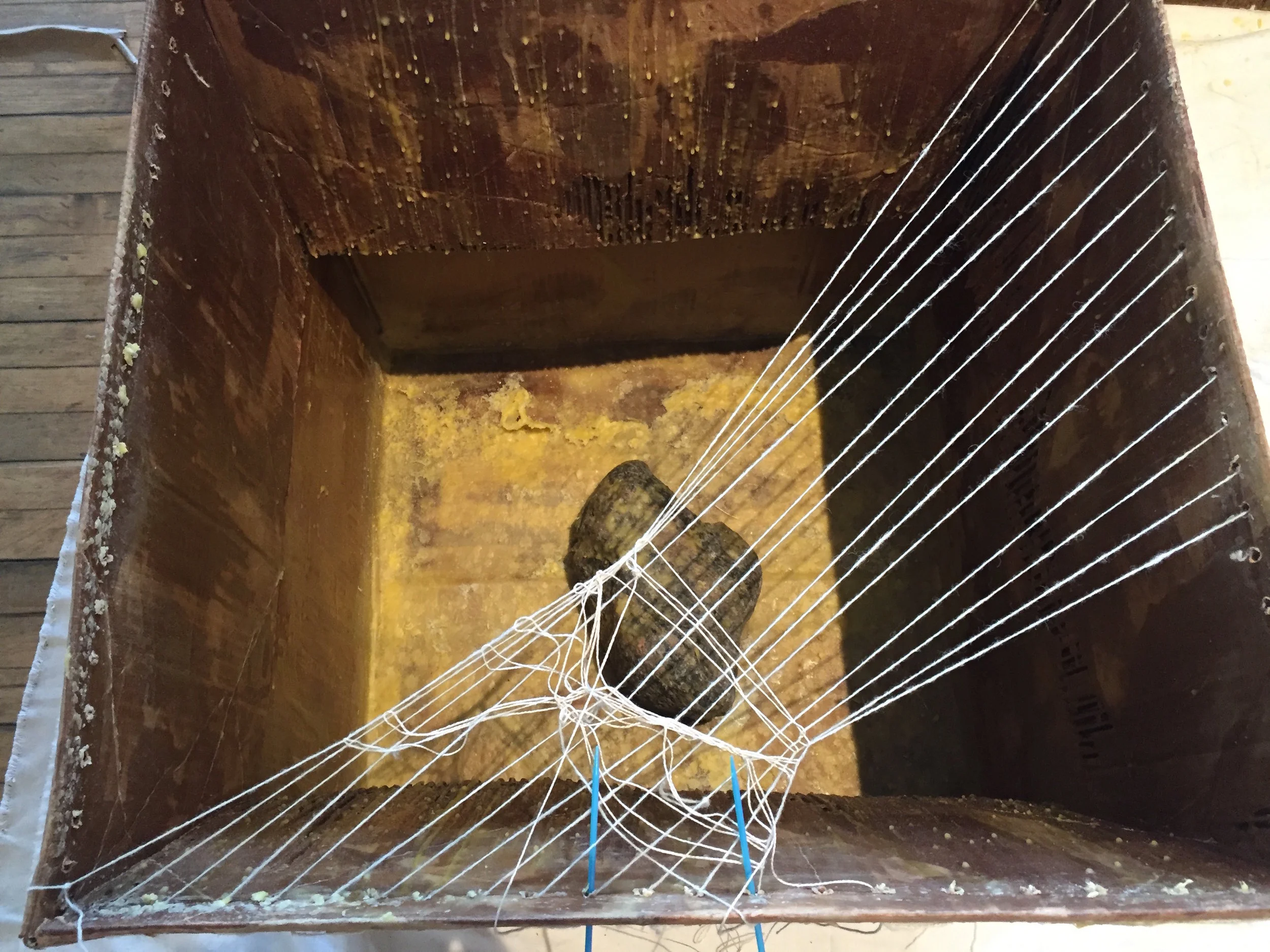 An interactive work held over a four day period in which the public was invited to engage in collective weaving. Participants created weavings on cardboard box looms that had been coated with beeswax, filled with water and weighted with large rocks. After each weaving was completed, participants were asked to coat their pieces with melted beeswax, cut them from the box looms upon drying, and tie them to a net that hung above the workspace. After four days, the net was heavy with weavings. The cardboard boxes and blanket upon which participants worked was covered in wax strokes and drippings, leaving a record of their actions.