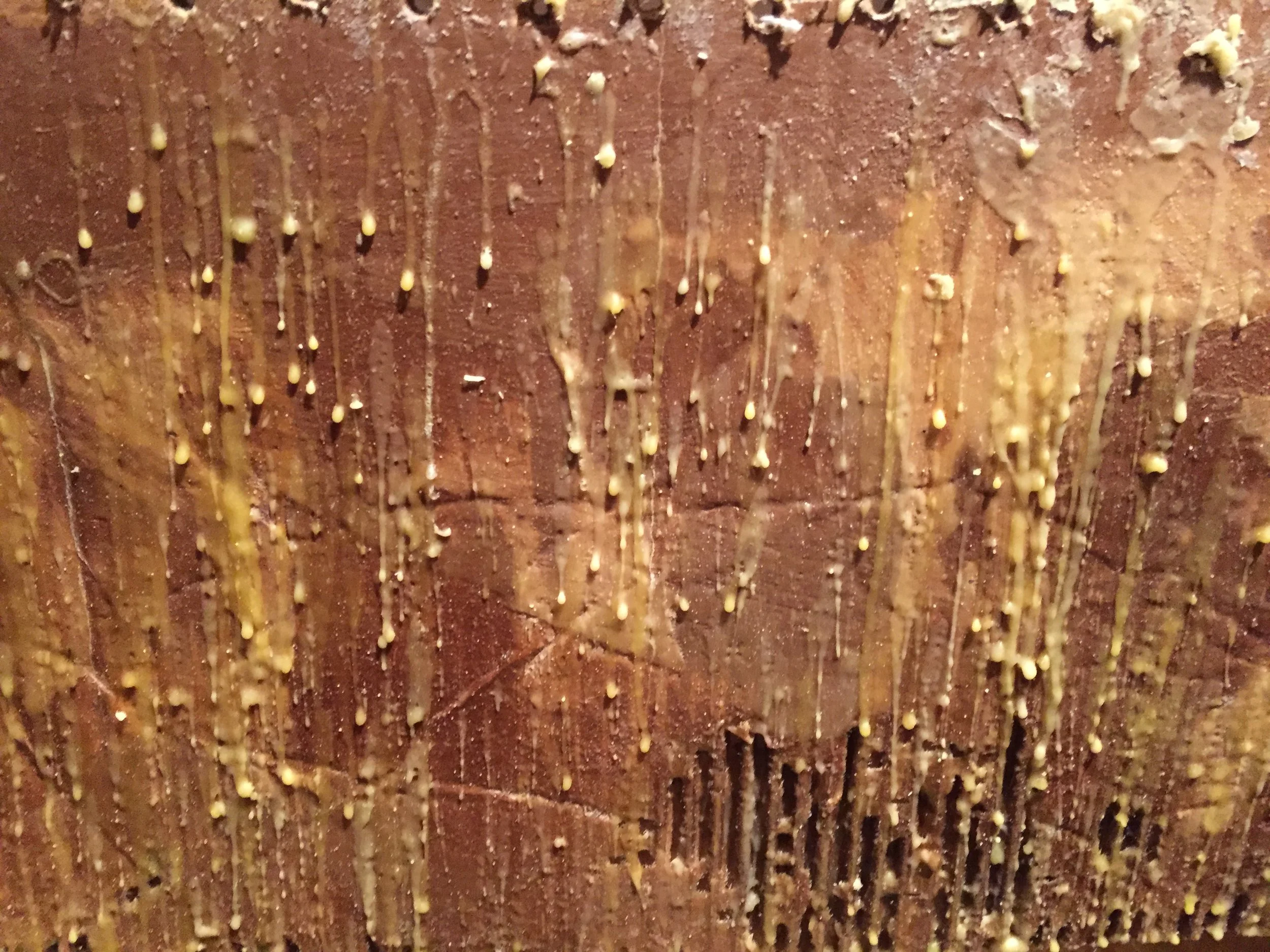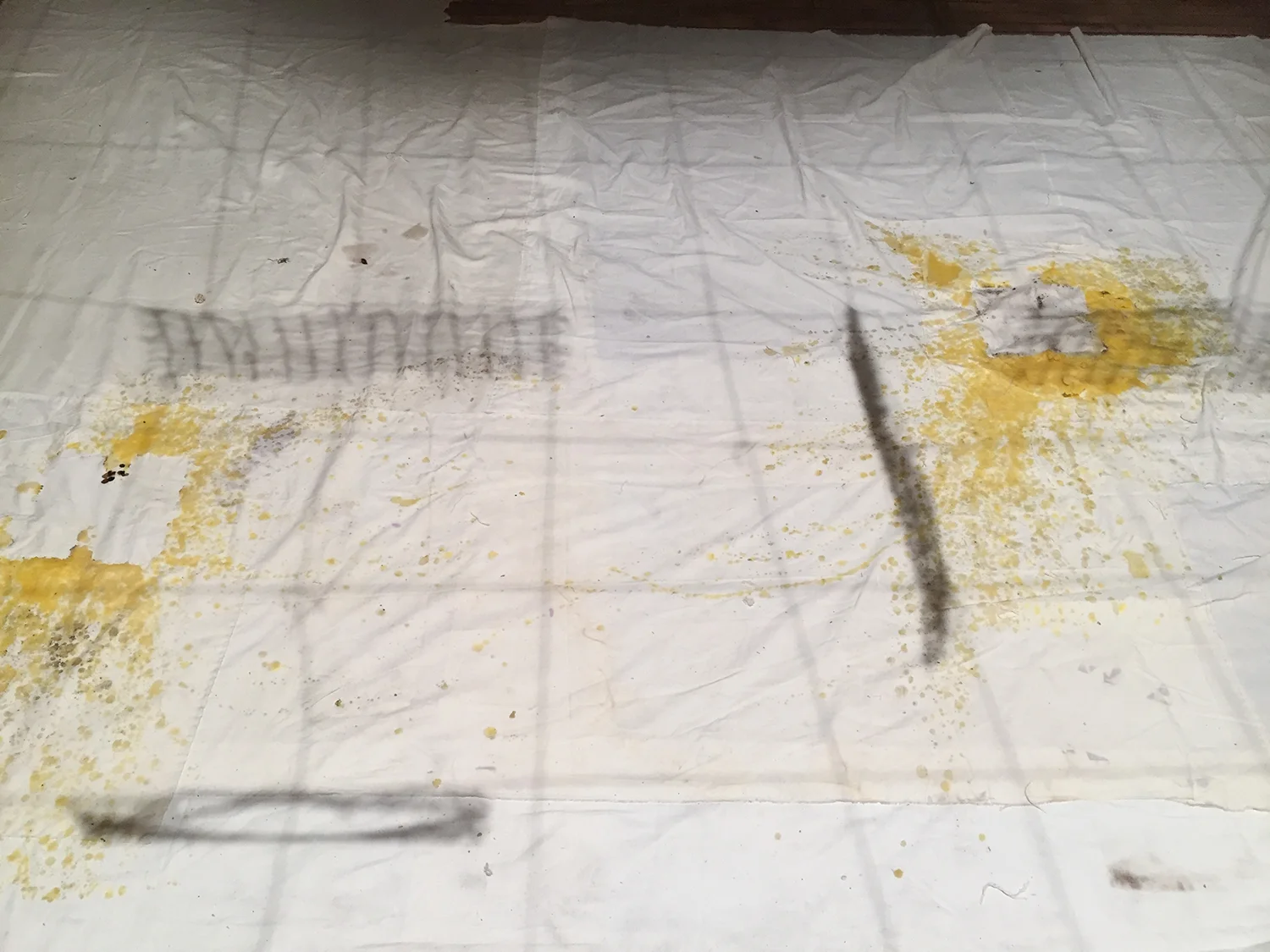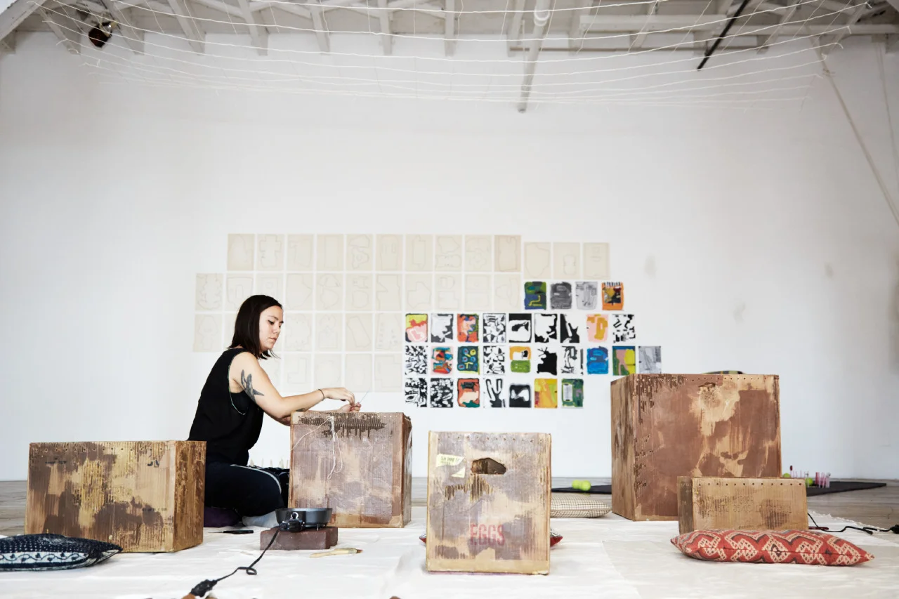 An interactive work held over a four day period in which the public was invited to engage in collective weaving. Participants created weavings on cardboard box looms that had been coated with beeswax, filled with water and weighted with large rocks. After each weaving was completed, participants were asked to coat their pieces with melted beeswax, cut them from the box looms upon drying, and tie them to a net that hung above the workspace. After four days, the net was heavy with weavings. The cardboard boxes and blanket upon which participants worked was covered in wax strokes and drippings, leaving a record of their actions.